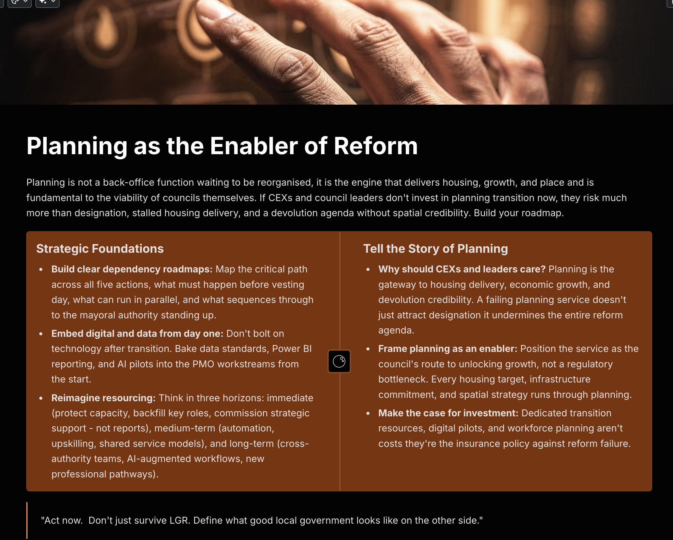 Between LGR, devolution and the return of strategic planning, this is a window to design the future service not just to survive transition. Planning isn’t a back office re‑org; it’s the engine for housing delivery, infrastructure credibility and spatially‑literate devolution. Let’s use 2026 to set the governance, performance, people and data foundations that endure beyond vesting day.