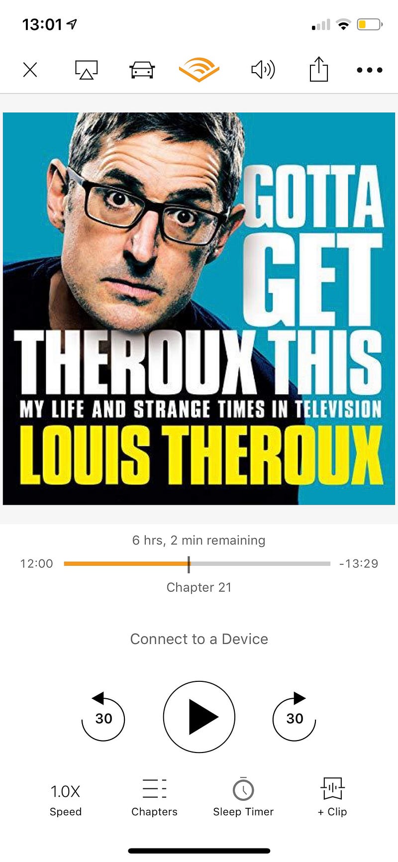 I’ve been tackling Louis Theroux’s new audiobook ‘Gotta get Theroux this’ this week and last week. He is an amazing writer has huge amount of incredible stories which he tells immaculately – even better it being narrated by him! I wish had half of his vocabulary and uncanny ability of being self-deprecating, intelligent, funny and honest all at the same time. No pods of late and with six hours left of this audiobook I’m totally engrossed.